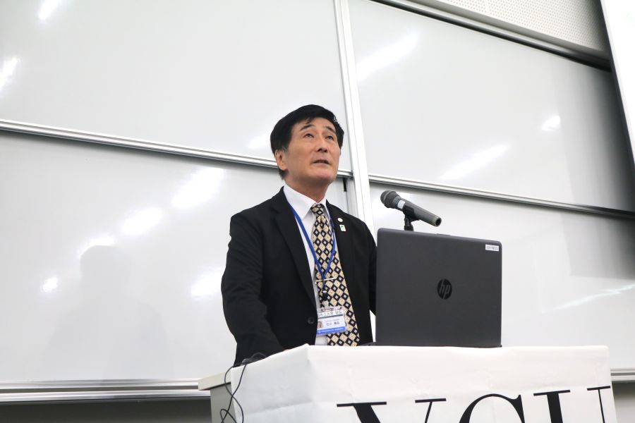 横浜市立大学学長からは、本学のミッションや教育・研究の特長、そして学生の活躍状況について紹介がありました。教育面では、領域横断型プログラムや留学制度の充実など、学部間の枠を越えた学びの環境づくりに力を入れていることが説明されました。大学のトピックスとして、文部科学省の「地域中核・特色ある研究大学強化促進事業(J-peaks)」に採択され、「よこはまデータサイクル」の構築を通じて、未来社会におけるヘルスウェルビーイングの実現を目指す取り組みが紹介されました。さらに、こうした教育・研究の充実に加え、後援会と連携しながら、学生が社会を牽引する人材へと成長できる環境整備にも力を注いでいることが語られ、本学の魅力と今後の展望を力強くお伝えしました。