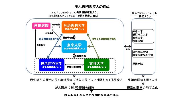 がん医療の均てん化が推進されている現在においても、根治ができない難治がんが多数存在することや、多面的な身体・精神症状に対する治療方法が不十分であることなど、がん医療には未解決の問題が山積しています。このような課題に対しては、がんに苦しむ人々の心に寄り添った医療を原点として、がんの本質的な研究が遂行できる環境を拡大整備し、多職種の医療人が異なる角度から臨床問題解決型の研究を行うことが必要です。そのために、本事業は、研究者養成に重点を置く東京大学に、教育改革(横浜市立大学・東邦大学)や地域医療(自治医科大学)を推進する3大学が連携することによって、最先端研究とがんの実地医療の両方に造詣を有し、広い視点からがん医療を先導し改革する能力を有する医療人を育成することを目標としています。このような医療人が継続的に輩出されることによって、がん治療のブレイクスルーとなる成果が得られるとともに、多面的ながんの苦痛が軽減されることが期待されます。