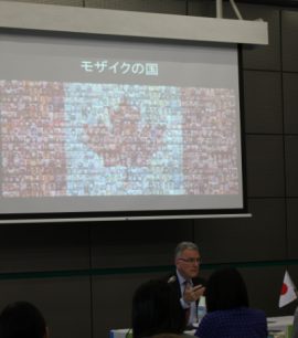 講演の締めくくりとして大使は、カナダの多様性については、その考え方を支える多くの取り組みや仕組み作りがなされているからこそうまく機能している、と強調されました。移民に対してオープンに受け入れることのメリットの1つは、多様性がその国に革新性をもたらし、異文化への適応力を高めることにある。移民は、基本的に複数の言語を話すことができ、文化に対しての意識も高く、海外へのネットワークがあることを考えると、経済にとっても有益であり、そういったことが、カナダの国民が移民に対して肯定的な考えをもつ要因になっているのではないか、とおっしゃいました。