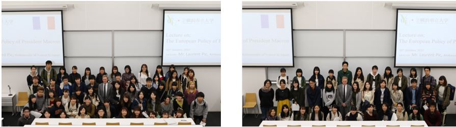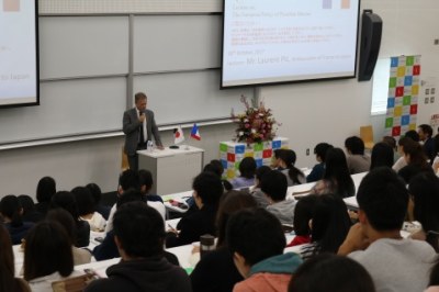 本年度は、2017年10月16日(月)に、フランスのローラン・ピック大使をお招きし、マクロン大統領のEU政策というテーマでご講演いただきました。モデレーターは、本学の渡會知子准教授が務めました。
