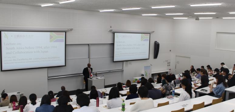 本年度は、2019年7月11日(木)に、南アフリカ共和国のルラマ・スマッツ・ンゴニャマ大使をお招きし、South Africa before 1994, after 1994 and Collaboration with Japanというテーマでご講演いただきました。モデレーターは、アフリカ研究の専門家でもある本学の吉田栄一教授が務めました。