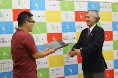 香港の学生からは、お返しに、窪田学長へ歌の贈り物がありました。