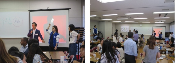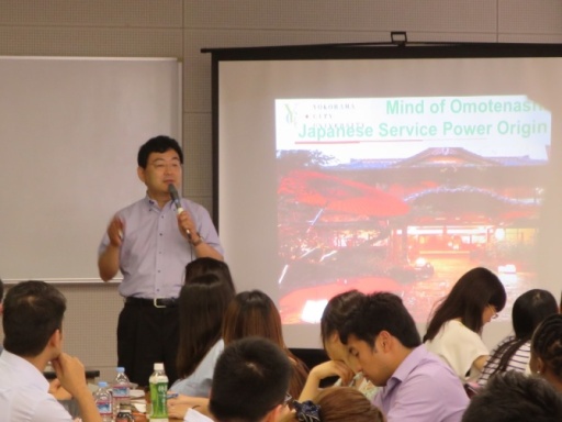 日本の「おもてなし」サービスの代表例として旅館を取り上げ、また、新幹線でのサービスについても説明されました。鴨志田教授から、新幹線は時間に正確で、事故をこれまで一度も起こしたことがないという説明があると、海外学生から「おー」という驚きの声があがっていました。