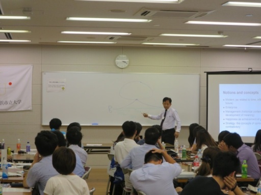 鴨志田教授の自己紹介に続き、サービス科学の概念についての講義が行われました。スライドを使いながら、日本の「おもてなし」サービスについて説明を始めると、ときおり海外学生が深くうなずきながらメモを取っていました。