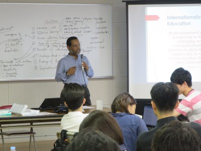 学生からの意見を聞いた後、 ビジネスにおける文化理解力の 重要性について述べ、そのため に必要な多文化との学生交流プ ログラムの可能性について示唆 をされました。 講義の後、総括としてRavi氏 から、高等教育の国際化、特に 急速にグローバル化が進むアジ アの教育について、講義がありま した。