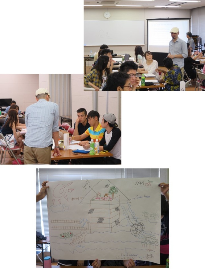講義の後はワークショップの時間になり、オオニシ准教授から参加学生に「未来のエネルギー都市」を模造紙に自由に描くように指示が出されました。参加学生はどのような都市を創造するかお互いにディスカッションをしながら、また時にはオオニシ准教授のアドバイスを得ながら作業を進めていました。