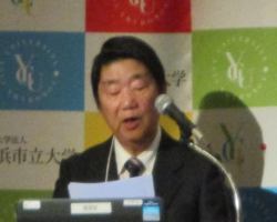 続いて、今回のイベントの協賛企業である株式会社日新の筒井雅洋代表取締役社長/業務執行責任者より開催にあたってのメッセージをいただきました。株式会社日新は、1938年に創業した社員6000人以上を抱える物流の企業で、現在、アジアの12地域・国を含む24の地域・国でグローバルに事業展開しています。メッセージでは、持続的な社会の発展にとって、世界のマーケットで活躍できる若者の育成が不可欠であること、また、そのために横浜市立大学とますますの連携をはかり、持続的な社会とより良い教育システムの発展に寄与する意気込みが語られました。