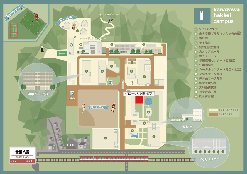 A. 八景キャンパスグローバル棟にあるグローバル推進室では、パンフレットをはじめ、語学能力試験のご案内など自由に手に取っていただける資料を用意しています。また、YCU留学プログラムに参加した先輩の体験談や報告書なども閲覧することができます。